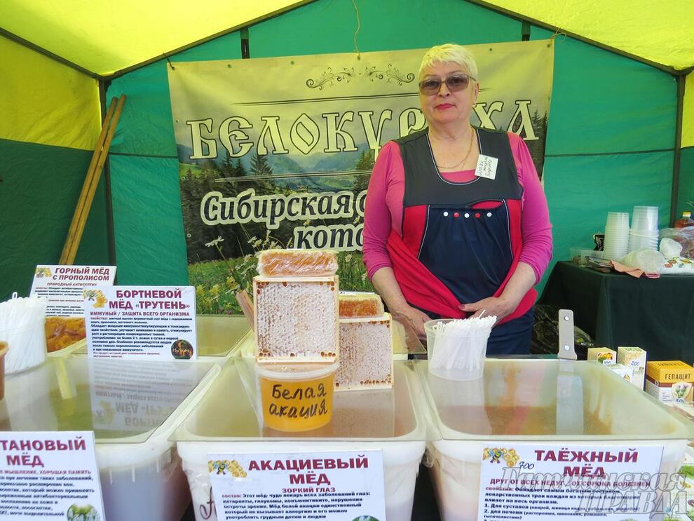 Представительница одного из постоянных участников гатчинской ярмарки алтайской компании «Белокуриха» Надежда Болдырева привезла в Гатчину алтайский мед разных видов — таежный, горный с прополисом, акациевый, каштановый, бортневой. Как она рассказала, такое разнообразие медовой продукции дает передвижная пасека.