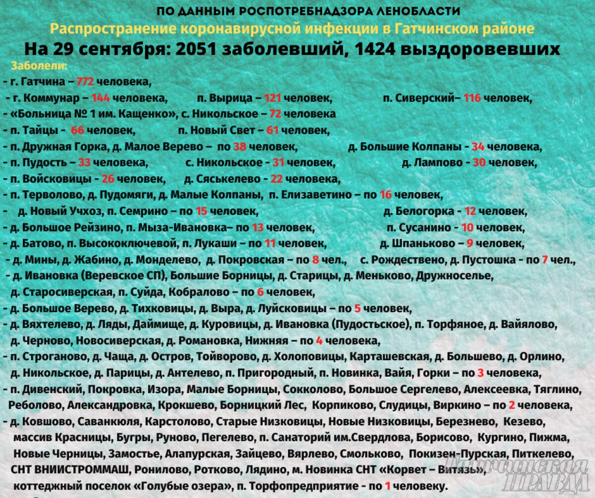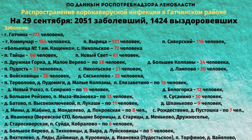 В целом по Гатчинскому району на 29 сентября коронавирусная инфекция подтверждена у 2051 человека, 1424 из их числа – 69,4 % - выздоровели, зарегистрирован 31 летальный исход.