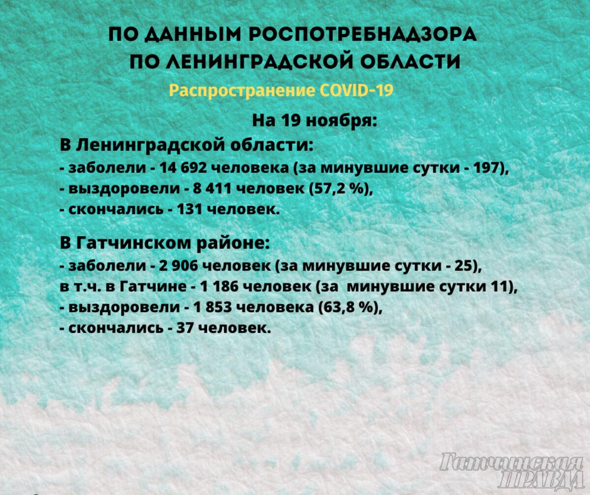 В Гатчинском районе за минувшие сутки выявлено 25 новых случаев заболевания коронавирусом в десяти населенных пунктах, а в целом по Ленинградской области – 197 человек. Таковы данные Роспотребнадзора на 19 ноября.