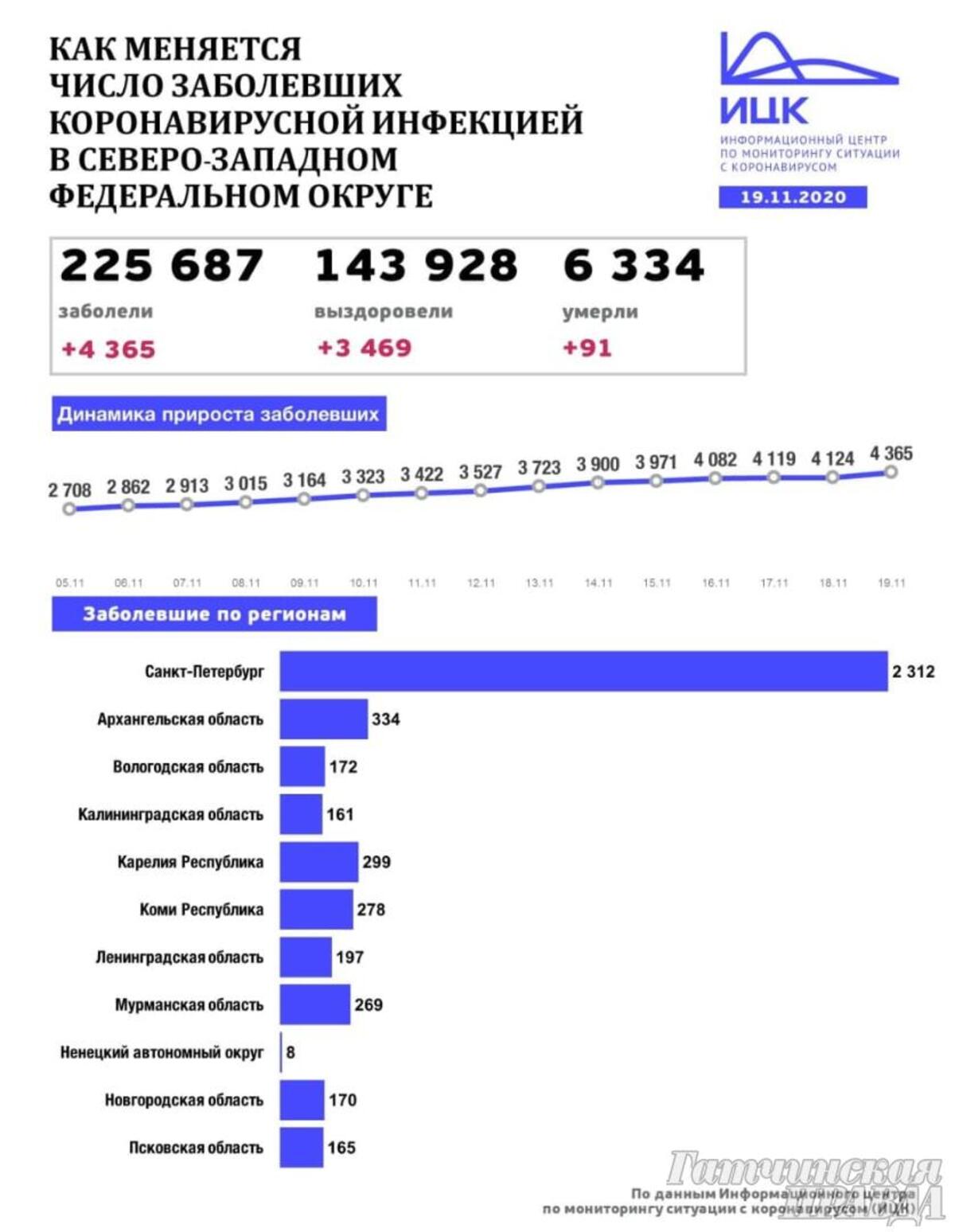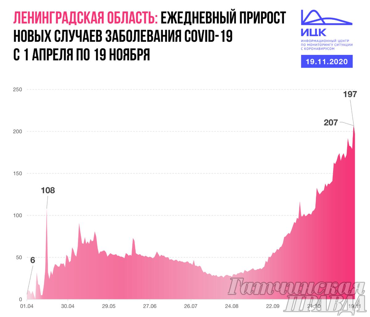 В Ленинградской области по данным Роспотребнадзора на 19 ноября коронавирусная инфекция диагностирована у 14 692 человек (в том числе за минувшие сутки выявлено 197 новых случаев), 8411 человек поправились, 131 скончался. Таким образом, поправились из числа заболевших ленинградцев 57,2 %.