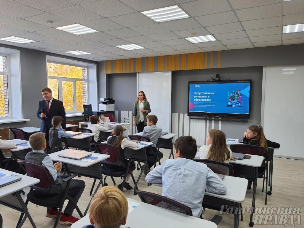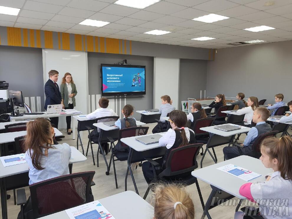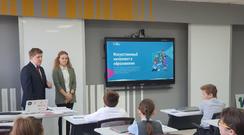 Педагоги дополнительного образования Анна Равина и Сергей Вихров в начале урока предложили ребятам посмотреть видеоролик об искусственном интеллекте (ИИ), в ходе которого они узнали, кто такие «цифровые кентавры» и как ИИ-технологии меняют привычные профессии уже сейчас. Ученики познакомились с понятием «искусственный интеллект» и узнали о возможностях его использования в работе на примере профессии учителя.