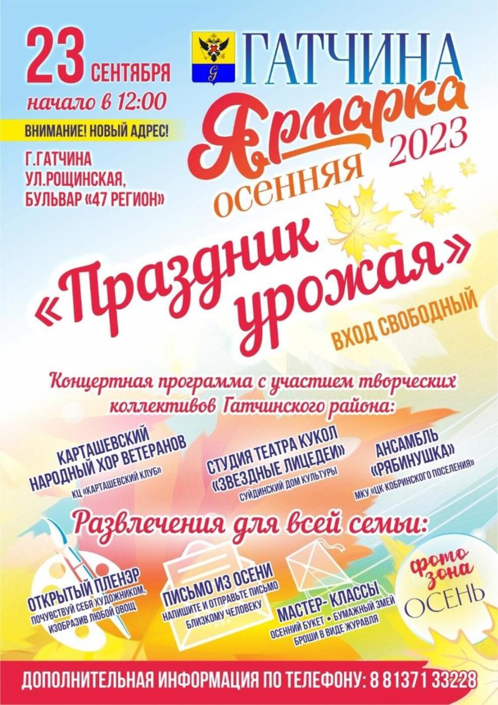 В субботу, 23 сентября, в 12 часов на ярмарке пройдет «Праздник урожая». В программе – концертная программа с участием творческих коллективов Гатчинского района, развлечения для всей семьи – мастер- классы и открытый плэнер. Будет оформлена осенняя фотозона.