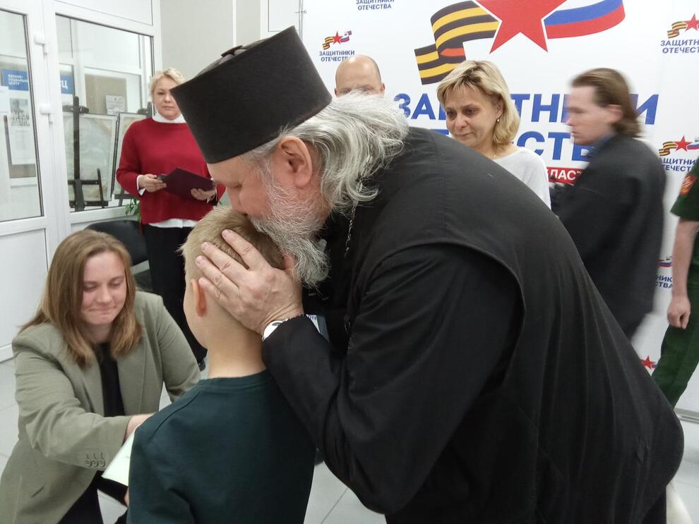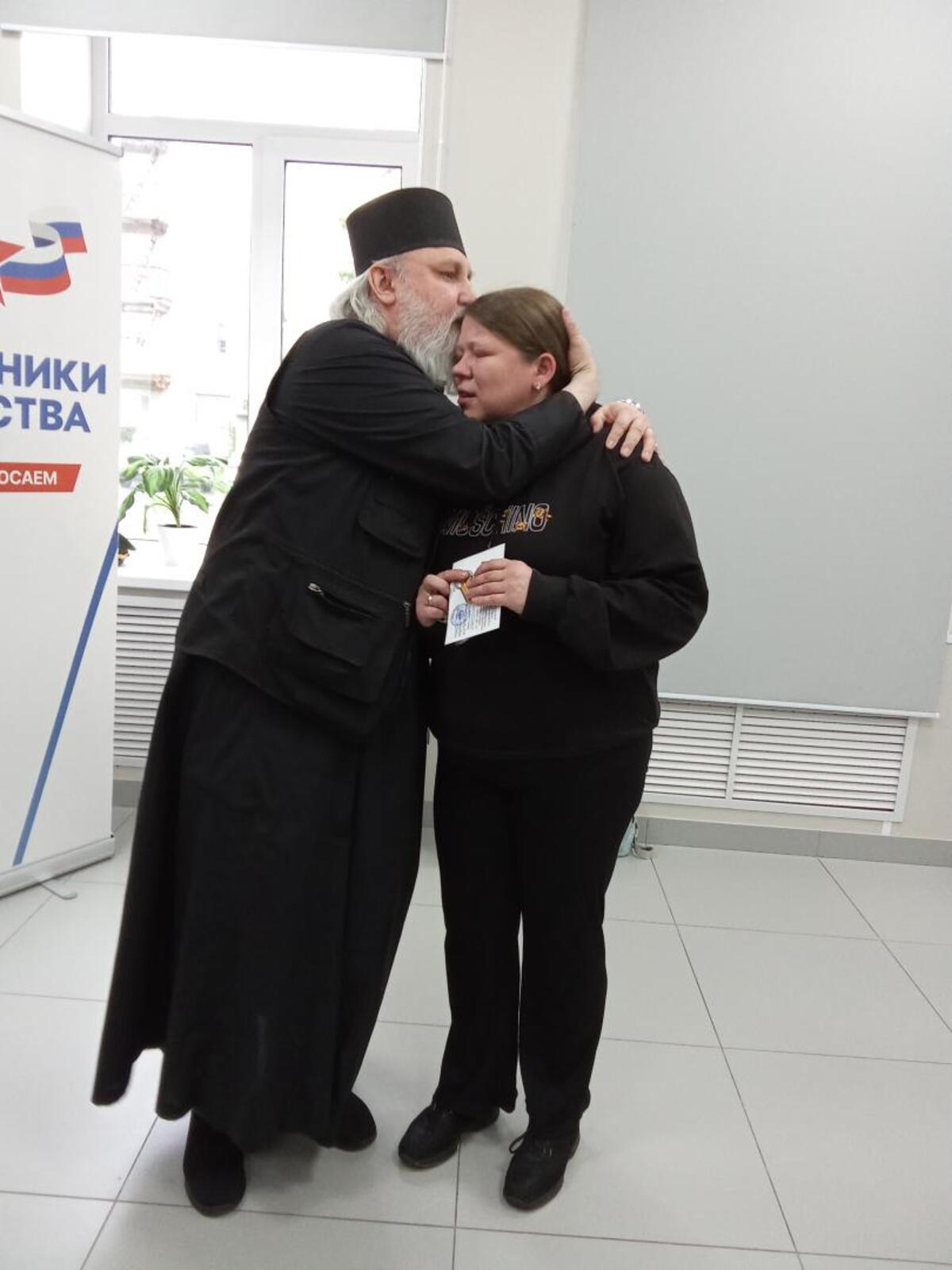 Иерей храма святого равноапостольного великого князя Владимира в городе Коммунаре Вячеслав Красноруцкий вручил Олегу Наседкину и жене Андрея Сафронова иконы.