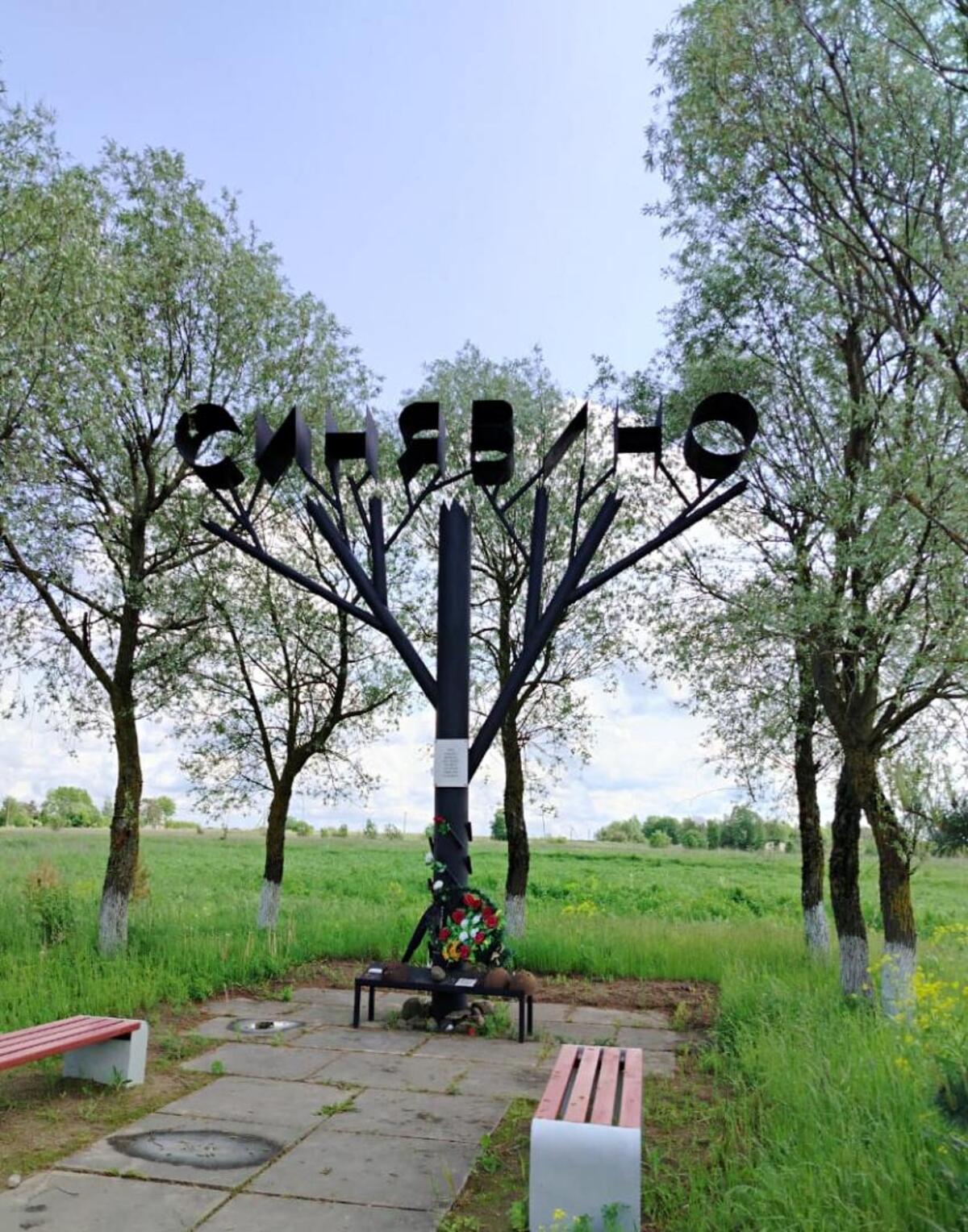 Дальше вновь понадобилась машина – мы отправились к селу Синявино. Вернее, к памятнику «Село Синявино, сожженное фашистами в 1941–1943 гг.». Железное дерево стоит между настоящих, пышущих жизнью. Когда-то здесь было 203 двора, а теперь – поле. Но если пройти налево, то можно увидеть стенд, посвященный проекту «Искра Ленинградской области». В ходе этого проекта было высажено более 400 саженцев сосны в форме слова «ИСКРА», по названию наступательной операции советских войск во время Великой Отечественной войны, позволившей прорвать блокаду Ленинграда. Роща-геоглиф навсегда сохранит память о подвиге нашего народа.