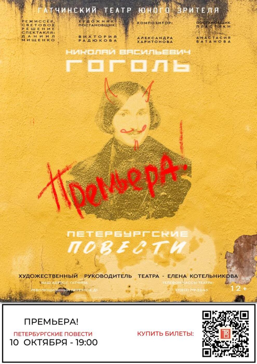 Премьера спектакля «Петербургские повести» состоится в Гатчинском ТЮЗе в пятницу, 10 октября, в 19.00 (Гатчина, Революционный переулок, д.1, Центр творчества юных).