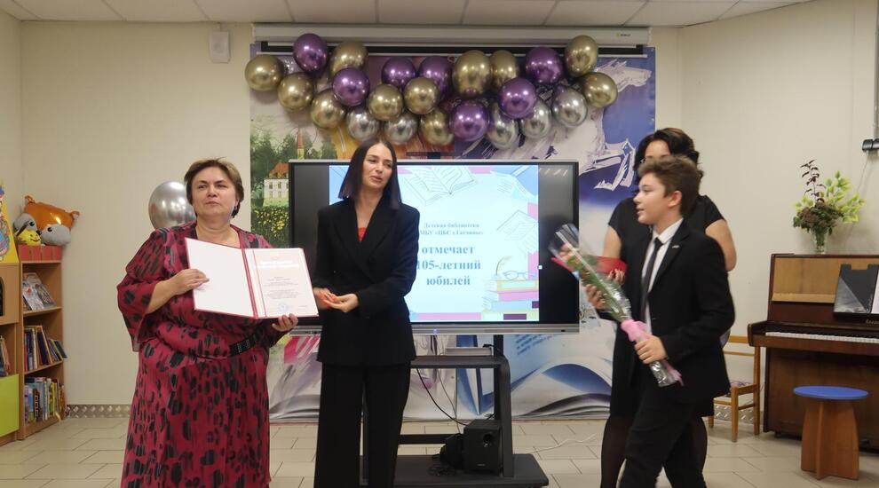 Поздравления от гатчинских депутатов Законодательного собрания Ленинградской области Людмилы Тептиной, Татьяны Бездетко, Олега Белова, Сергея Коняева, Александра Русских передала Валерия Кургина. Она вручила коллективу детской библиотеки поздравительный адрес и сертификат на сумму 500 тысяч рублей на укрепление материально-технической базы.