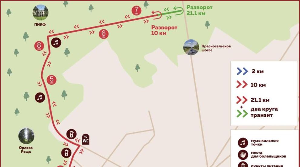 Старты забегов проходят в разное время. В 10.30 – старт на дистанцию 10 км, в 10.40 – на дистанцию 2 км, в 12.00 – старт на дистанцию 21,1 км.