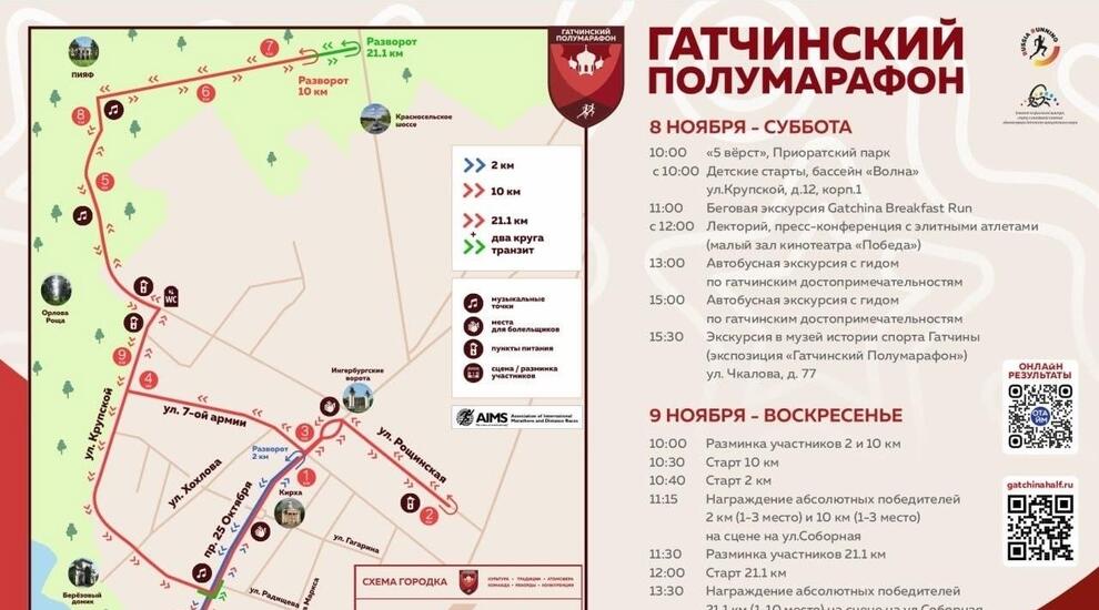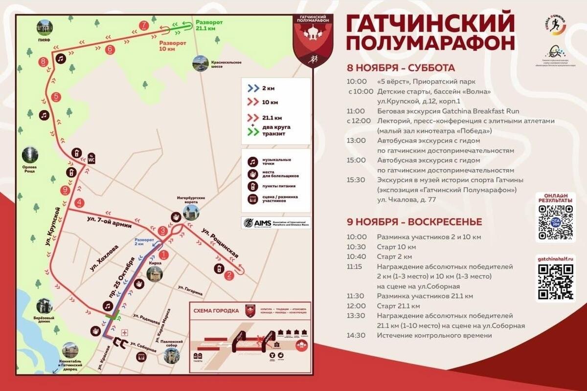 9 ноября 2025 года с 8.00 до 15.00 в связи проведением XVI Гатчинского полумарафона будет перекрыто движение и ограничены парковки транспортных средств на дорогах в Гатчине. Движение общественного транспорта будет осуществляться в объезд.