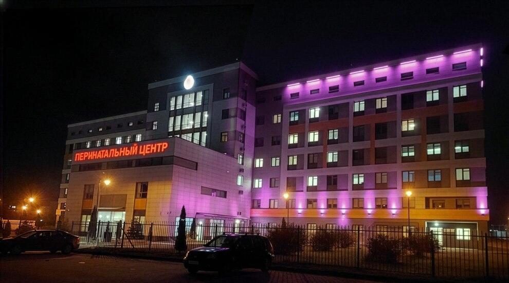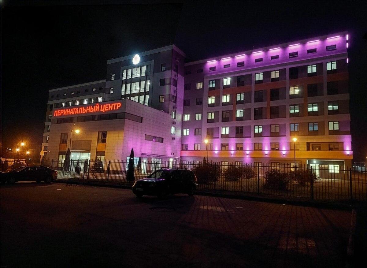 В честь Международного дня недоношенных детей, который отмечают 17 ноября, на несколько минут здание Ленинградского областного перинатального центра в Гатчине подсветили фиолетовым цветом.