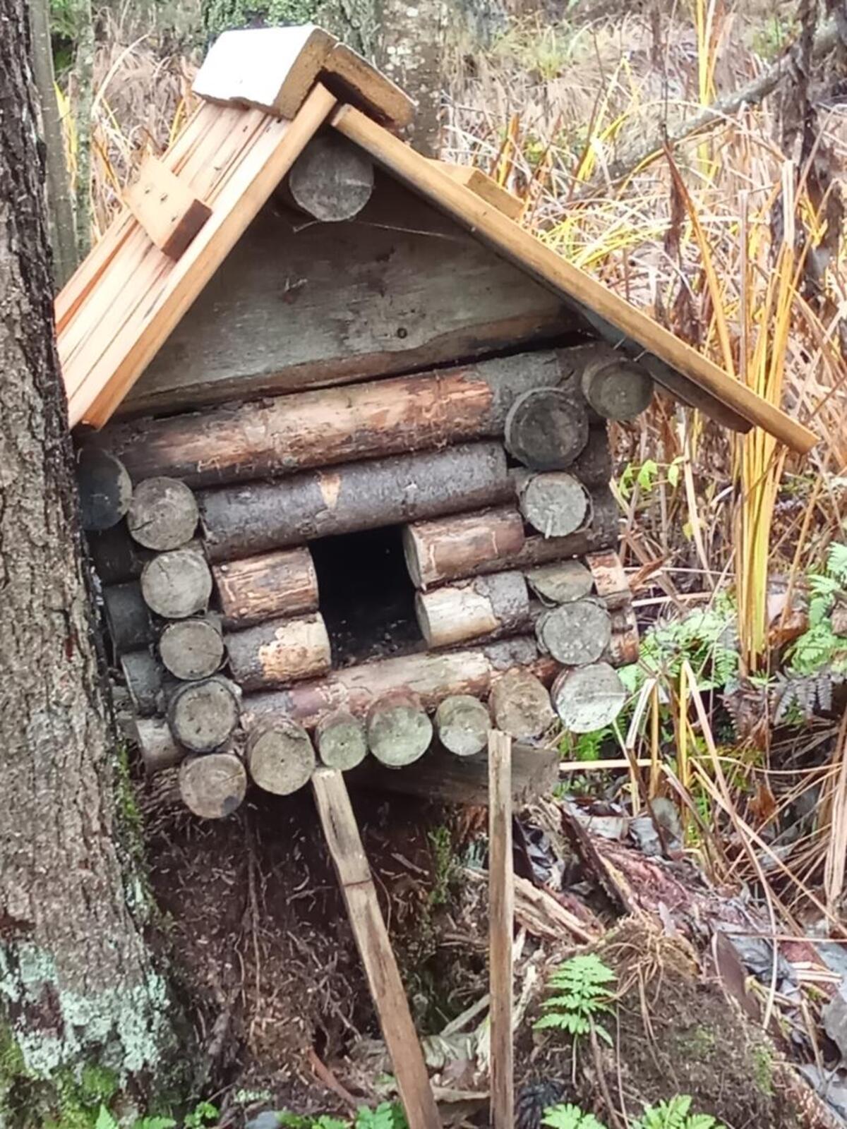 Вдоль тропы – избушки на курьих ножках, ежики, над головой парят птицы и диковинные колокольчики. Всё исключительно из природного материала: трава, веточки, палочки, ягодки. Этот «средовой дизайн» выполнен с участием студентов Школы дизайна Гатчинского университета. Понятно, что такие арт-объекты – не долгожители, но зато среда безмусорная. Упало, сгнило – сделали новые.