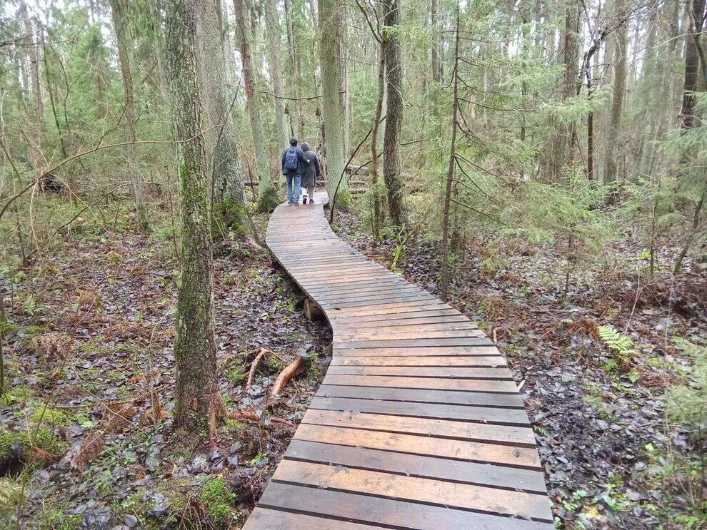 Благодаря удобному настилу парим над топкими кочками и двигаемся вглубь лесополосы к берегу речки. Настил через болото делали сотрудники отдела «Зверинец» ГМЗ «Гатчина». Всё из дерева, только в начале тропы, где совсем вода и топко, настил на металлических сваях.
