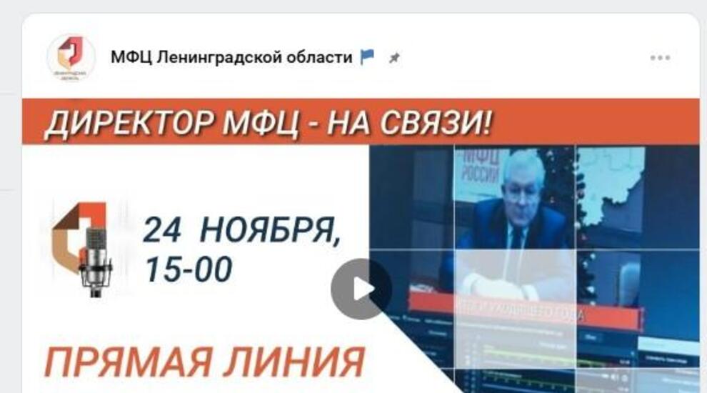 24 ноября, в 15:00, руководство МФЦ Ленинградской области проведет прямую линию для жителей региона.