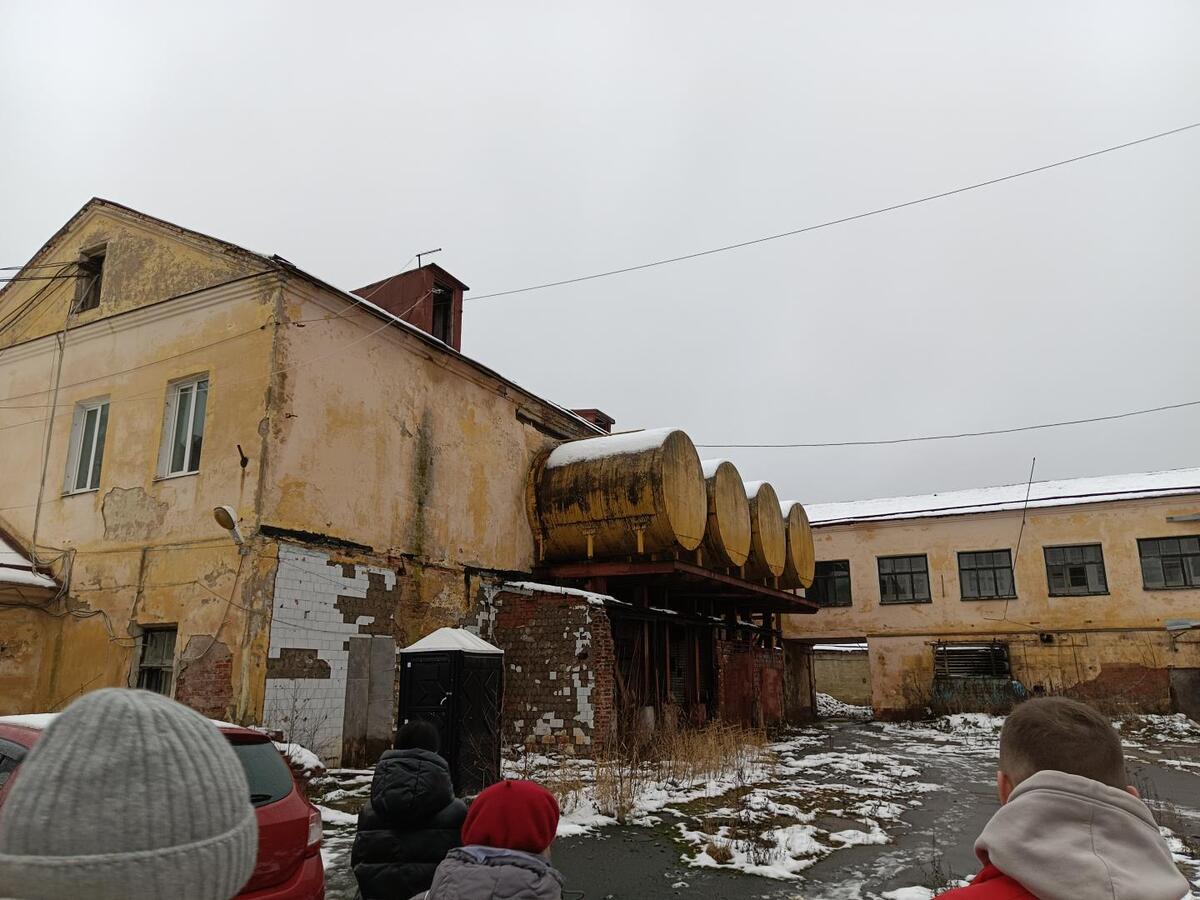 Для полного погружения студентов привезли на молокозавод. Несмотря на разруху, территория до сих пор охраняется, проходная – на своем месте. За стенами прячутся здания с ободранной штукатуркой и осыпающимся кирпичом, окна местами отсутствуют, местами заложены, двери нараспашку. Внутри корпусов завода – мерзость запустения. На второй этаж подниматься не рекомендуется ввиду ветхости перекрытий, но достаточно заглянуть на первый, чтобы увидеть старинные сводчатые потолки как доказательство историчности здания. Да, сегодняшний молокозавод представляет собой унылое зрелище – классическая «заброшка», но сквозь наслоения бесхозяйственных десятилетий проглядывают свидетельства лучших времен.