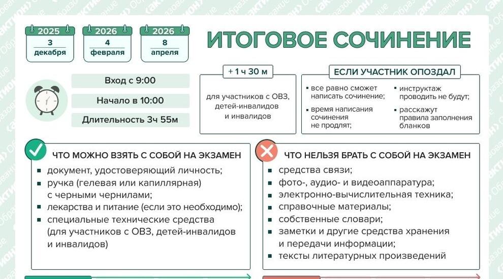 Итоговое сочинение (изложение) в этом учебном году проводится 3 декабря 2025 года, а также в дополнительные даты - 4 февраля и 8 апреля 2026 года.