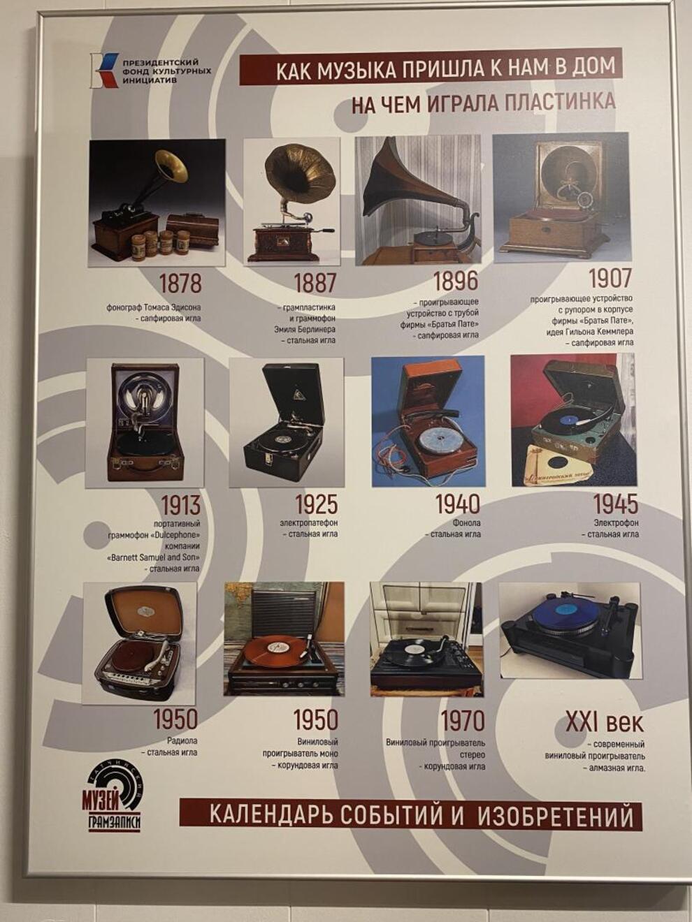 Проект «Гатчинский музей грамзаписи» поддержан Президентским фондом культурных инициатив. Руководитель проекта Анатолий Горбатенко представил первым посетителям основные этапы развития грамзаписи в России. В честь праздника прозвучал самый «взрослый» экспонат выставки – фонограф Эдисона и его более «молодые» коллеги – аппараты для проигрывания граммофонных пластинок XIX, XX и XXI века.