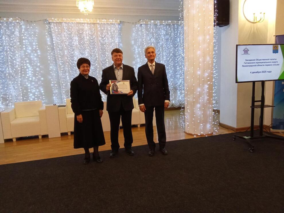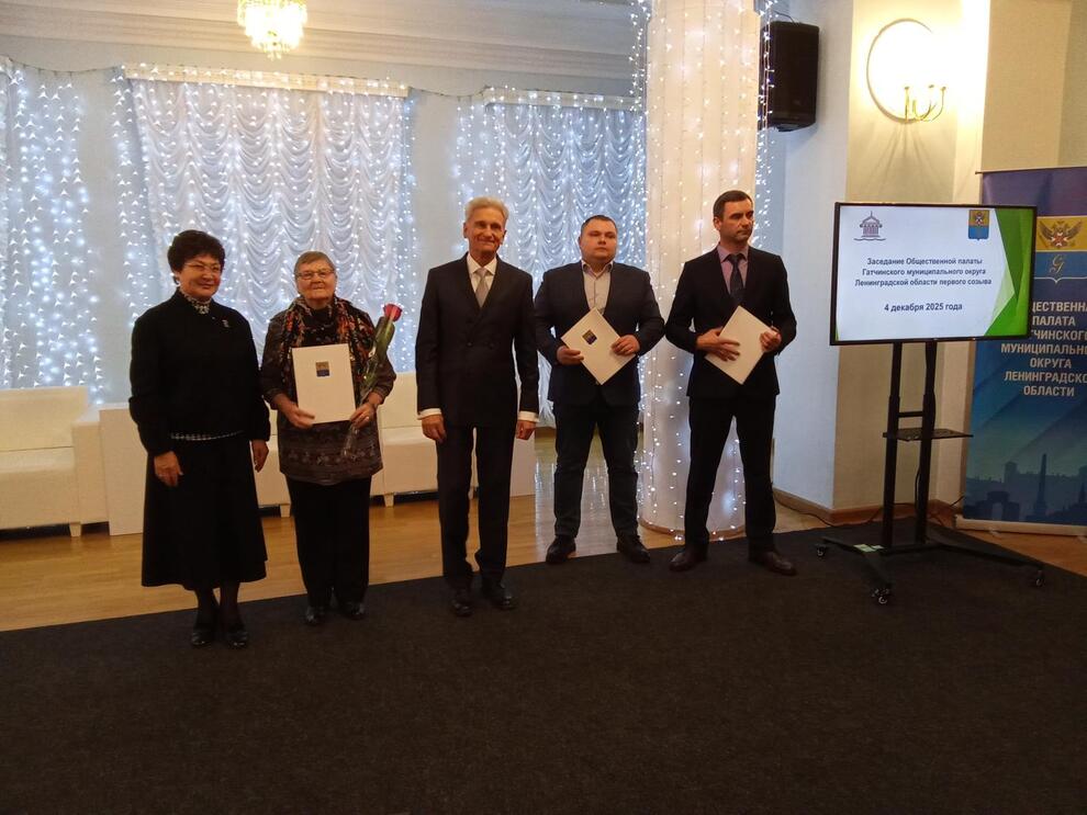 Благодарственными письмами главы администрации Гатчинского округа за активную деятельность и по результатам работы Общественной палаты Гатчинского округа в 2025 году награждены Павел Беляков, Марсель Васильев, Жанета Гриненко, Светлана Зубак, Юрий Назаров, Екатерина Потоцкая, Александр Сидоркин и Марина Крупина.