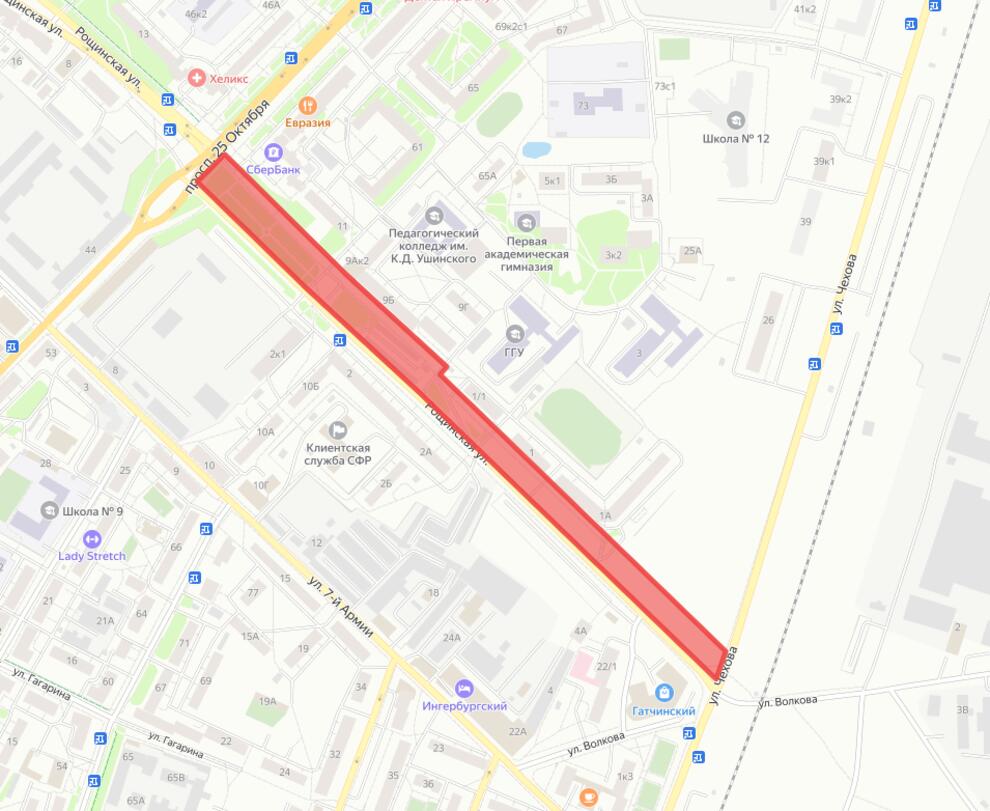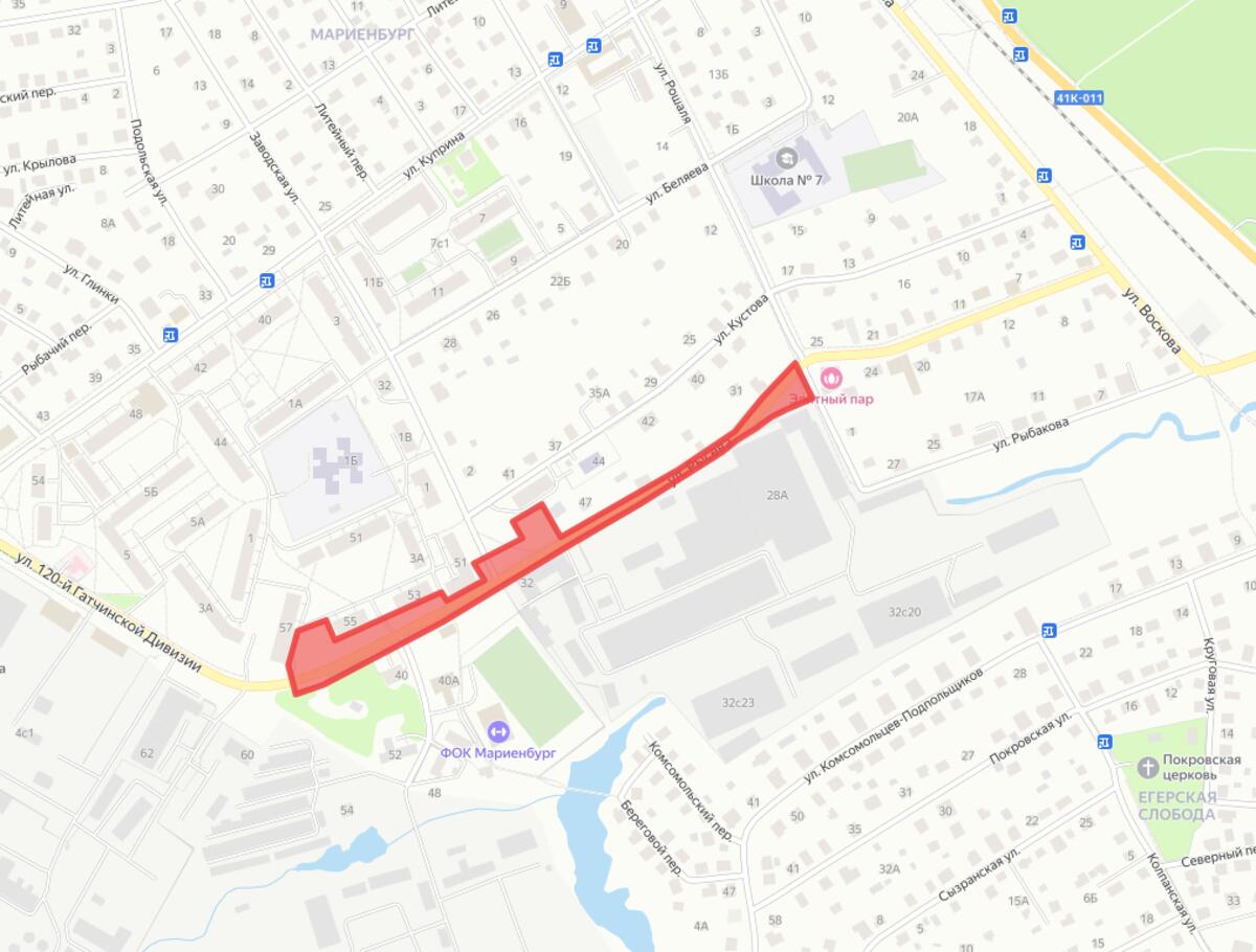 - вдоль ул. Рысева на участке от ул. 120-й Гатчинской Дивизии до ул. Рошаля в микрорайоне Мариенбург (продолжение),
