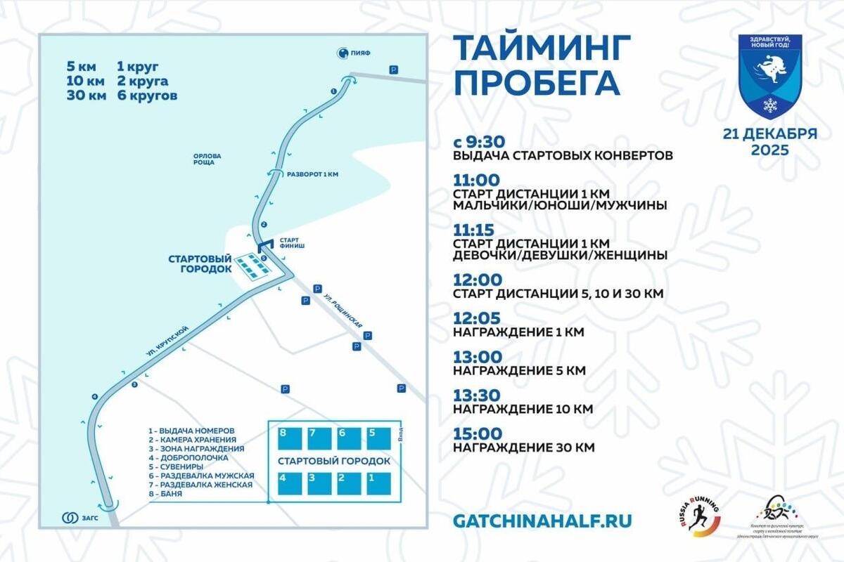 Гатчинский полумарафон 21 декабря проведет заключительный пробег этого года, который будет называться «Здравствуй, Новый год!».