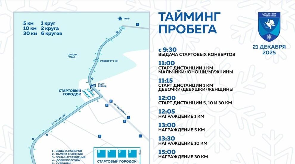 Всего будет четыре дистанции: 1 км, 5 км, 10 км и 30 км. Старт и финиш забега расположены недалеко от пересечения улиц Рощинской и Крупской. Длина круга – 5 км. Для участников, преодолевающих дистанцию 1 км, будет организован разворот. Старт дистанции 1 км – 11:00, остальные старты – в 12:00.