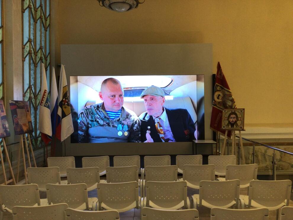 Спас Нерукотворный, выполненный Светланой и Ларисой Амальскими, выставлен на отдельном стенде рядом с боевым стягом справа от главного экрана в зале. А на экране в режиме нон-стоп вместе с информацией о выставке демонстрируется документальный фильм гатчинского медиахолдинга «Ореол-ИНФО» «Два Вадима и "Победа"». Его герои – участник Великой Отечественной войны Вадим Марголин и ветеран СВО Вадим Новожилов – настоящее олицетворение связи поколений героической Гатчины.