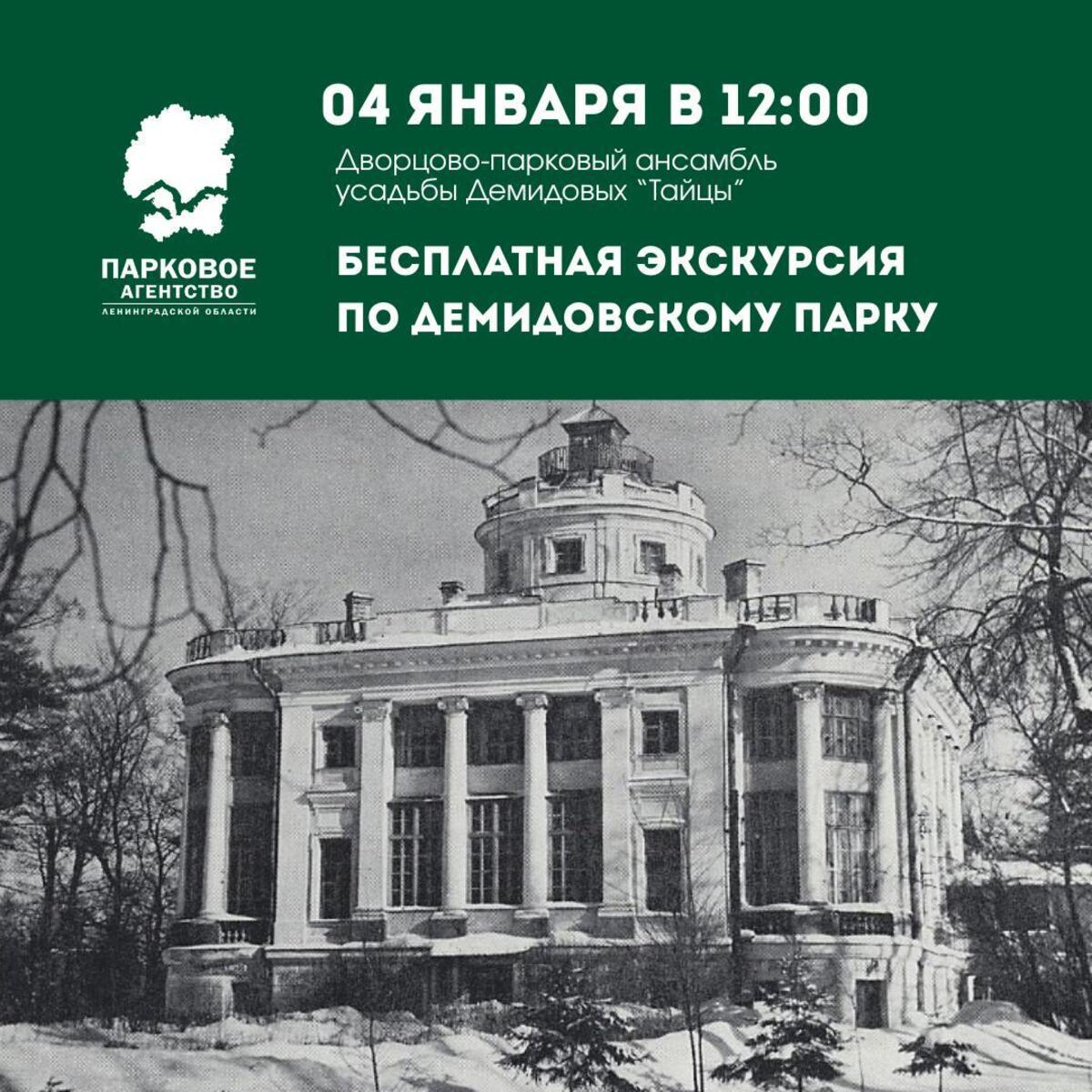 4 января в 12:00 состоится пройдет бесплатная экскурсия по Дворцово-парковому ансамблю усадьбы Демидовых «Тайцы». Гости совершат часовую прогулку по старинному усадебному парку, откроют для себя удивительные тайны богатейшей семьи горнозаводчиков, познакомятся с сохранившимися и утраченными архитектурными объектами и ландшафтными особенностями ансамбля.