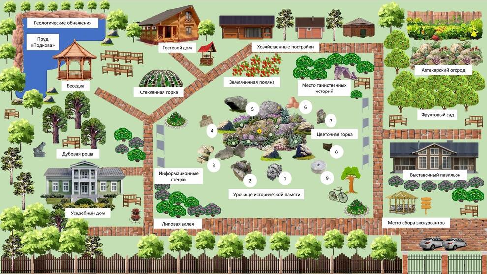 - Помимо Стеклянной и Цветочной горок на вашей примерной схеме будущей музейной усадьбы много и других интересных объектов. Расскажите немного о них...
