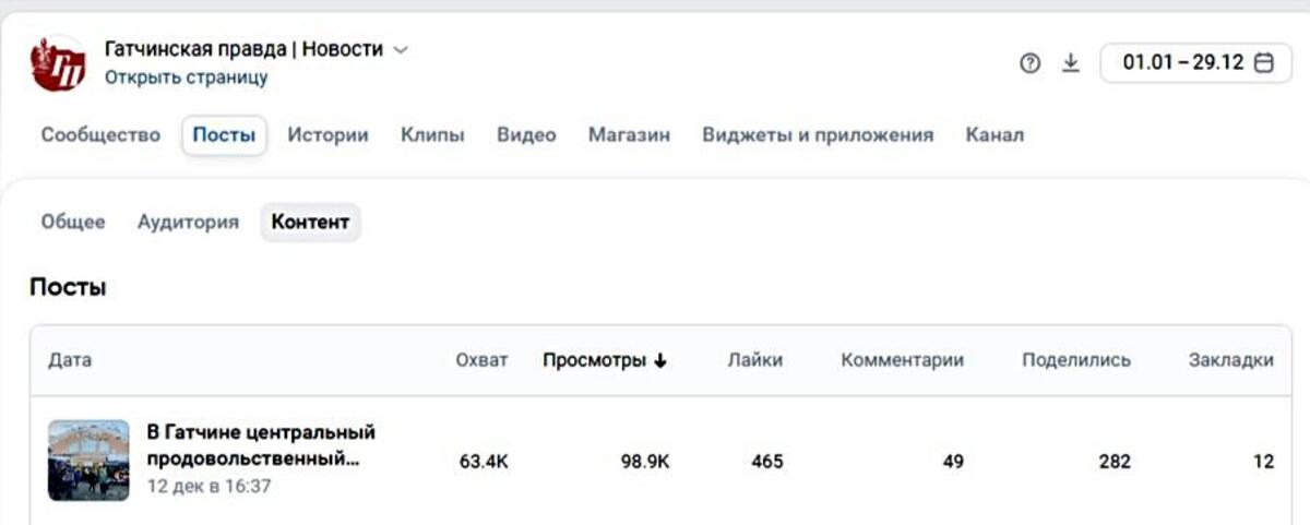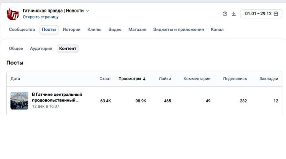 Перейдем к просмотрам. Здесь лидером стал небольшой фоторепортаж «В Гатчине центральный продовольственный рынок Гатчинского райпо открылся после ремонта», набравший 98,8 тысяч просмотров.