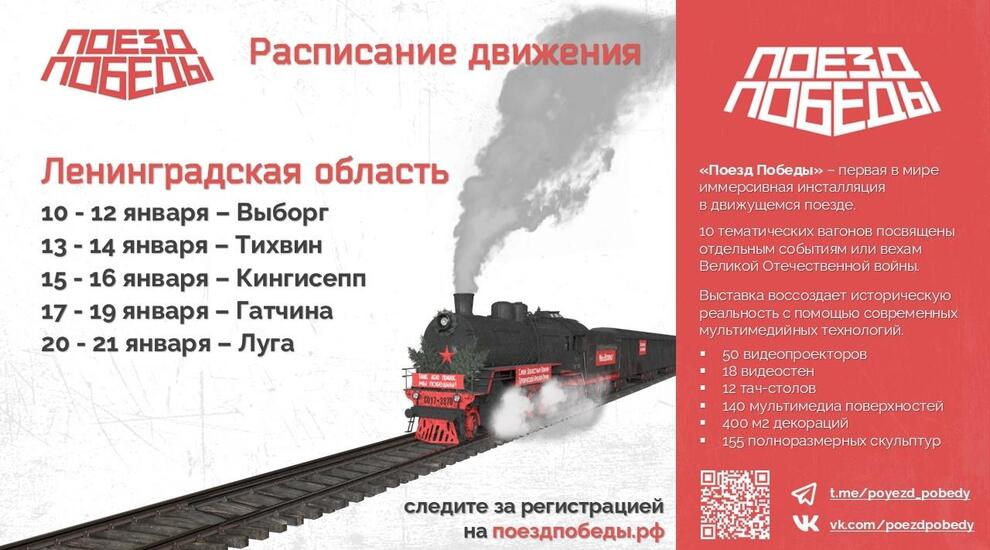 Первая в мире иммерсивная передвижная выставка «Поезд Победы» прибудет в Ленинградскую область. Гатчинцы смогут побывать в музее на колесах с 17 по 19 января.