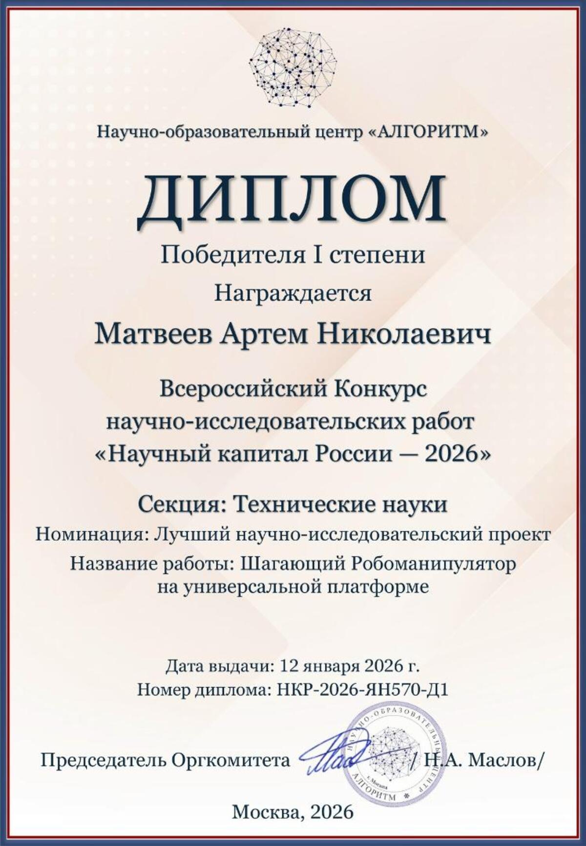 На Всероссийском конкурсе научно-исследовательских работ «Научный капитал России – 2026» ученик Гатчинской школы № 9 Артем Матвеев был удостоен высшей награды – диплома победителя I степени в секции «Технические науки» (номинация «Лучший научно-исследовательский проект»).