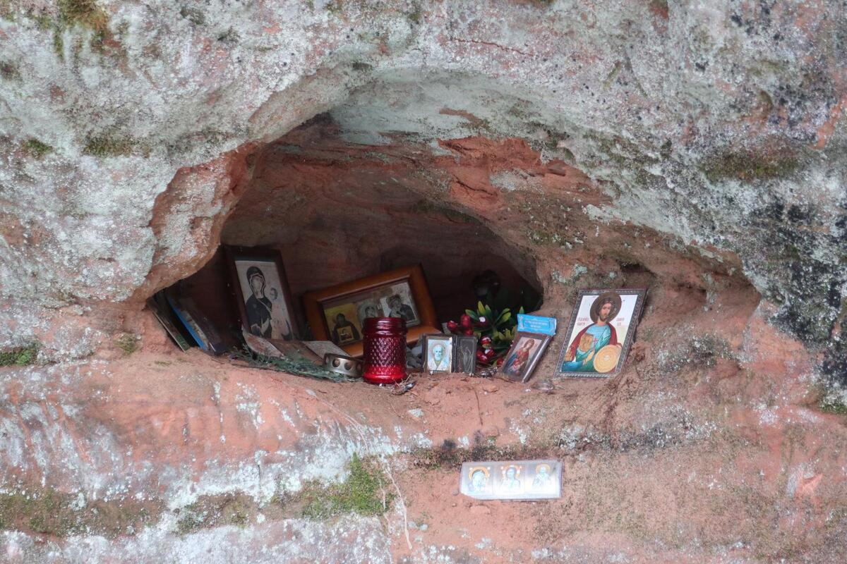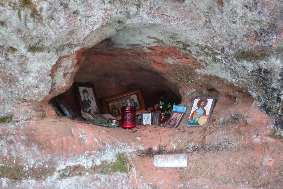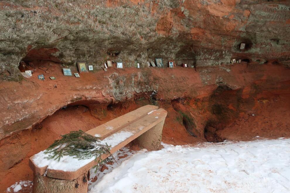 Если спуститься от креста по тропинке в сторону реки Грязны, слева можно увидеть вход в Святую пещеру, которая считается одним из природных чудес Ленинградской области. Святая пещера — всего лишь часть огромной, многокилометровой системы природных пещер, пробитых подземными родниками в толще красных девонских песчаников. Провалы в грунте, находящемся над подземными пустотами, здесь не редкость. Глядя на них, верится, что где-то под нашими ногами действительно укрывается таинственный Никольский храм.