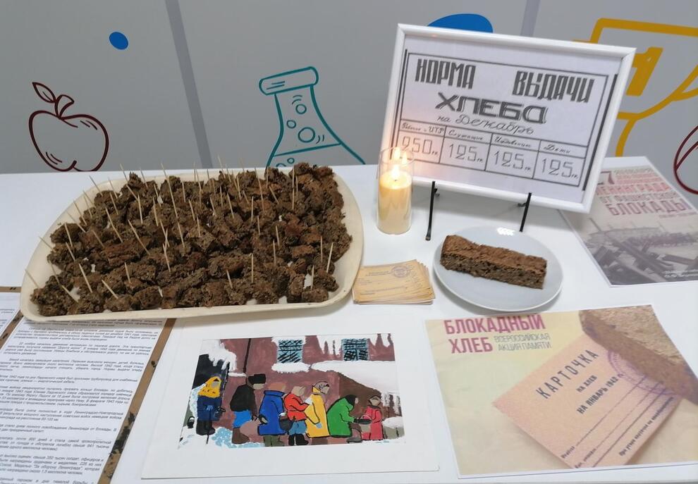 Заведующая школьной столовой Е.И. Бабурина заранее испекла хлеб по рецепту, максимально приближенному к блокадному. В его состав были включены ржаная мука, жмых подсолнечный, овсяные отруби, ржаной солод.