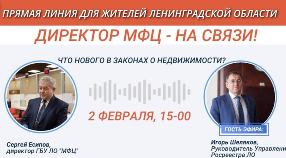 На связи с жителями региона будут директор региональной сети МФЦ Сергей Есипов и гость эфира - руководитель Управления Росреестра по Ленинградской области Игорь Шеляков.