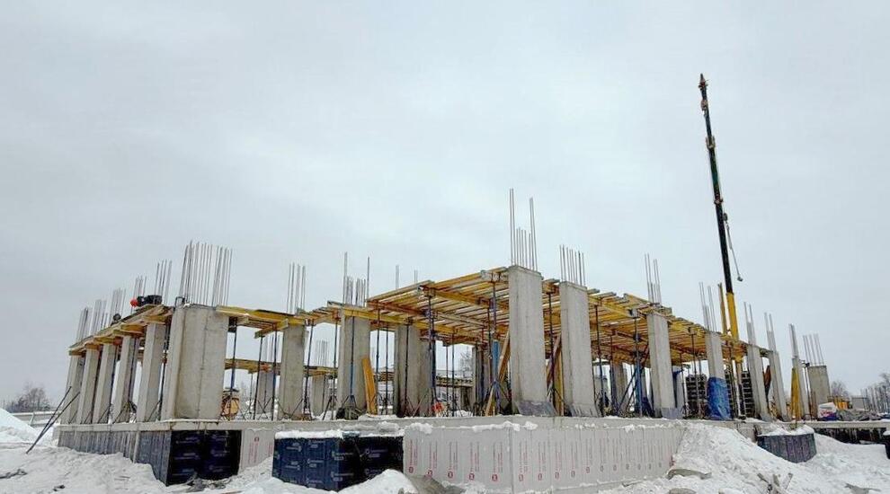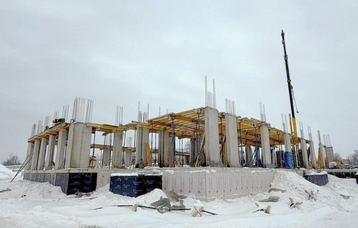 В селе Рождествено Гатчинского округа строители возводят стены и пилоны первого этажа Дома культуры на 150 мест.