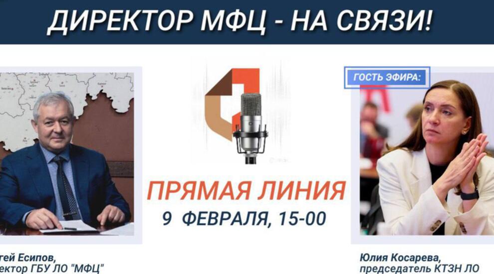 На вопросы ответят директор МФЦ Ленинградской области Сергей Есипов и приглашённые гости эфира: председатель комитета по труду и занятости населения Юлия Косарева и директор Кадрового центра Татьяна Иванова.