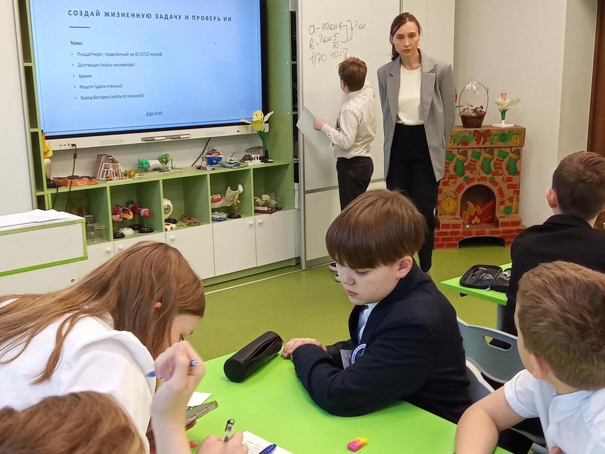 Учитель математики Гатчинского лицея № 3 Дарья Владимировна Клярцевич провела урок для 5-класников на тему «Математическая дуэль: Человек vs ИИ в сложении дробей с одинаковыми знаменателями». Дарья Владимировна предложила ребятам найти ошибки в подсказках и памятках от искусственного интеллекта, закрепить навыки устного счета, а затем, объединившись в команды, создать жизненную ситуацию и вновь проверить искусственный интеллект. Школьники быстро включились в игру и с азартом доказывали, что они умеют считать лучше, чем машина. Приятно отметить, что помимо основных задач урока, с которыми справились педагог и дети, решалась еще и злободневная задача – развитие творческого и критического мышления.