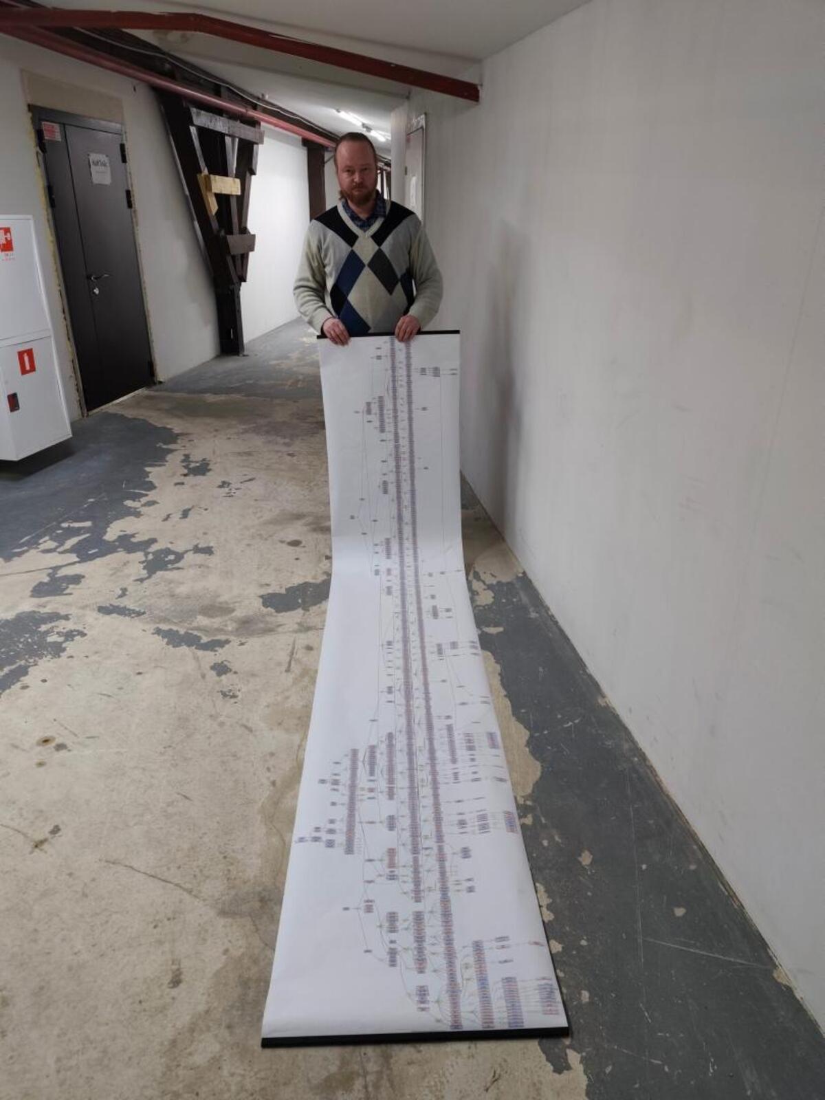 Чтобы лучше рассмотреть родословные, нам приходится опуститься на колени перед разно-цветной лентой. По остановкам, узлам и разветвлениям генеалогических путей легко скользят пальцы собеседника. Видно, что он хорошо знаком с запечатленными здесь переплетениями человеческих судеб.
