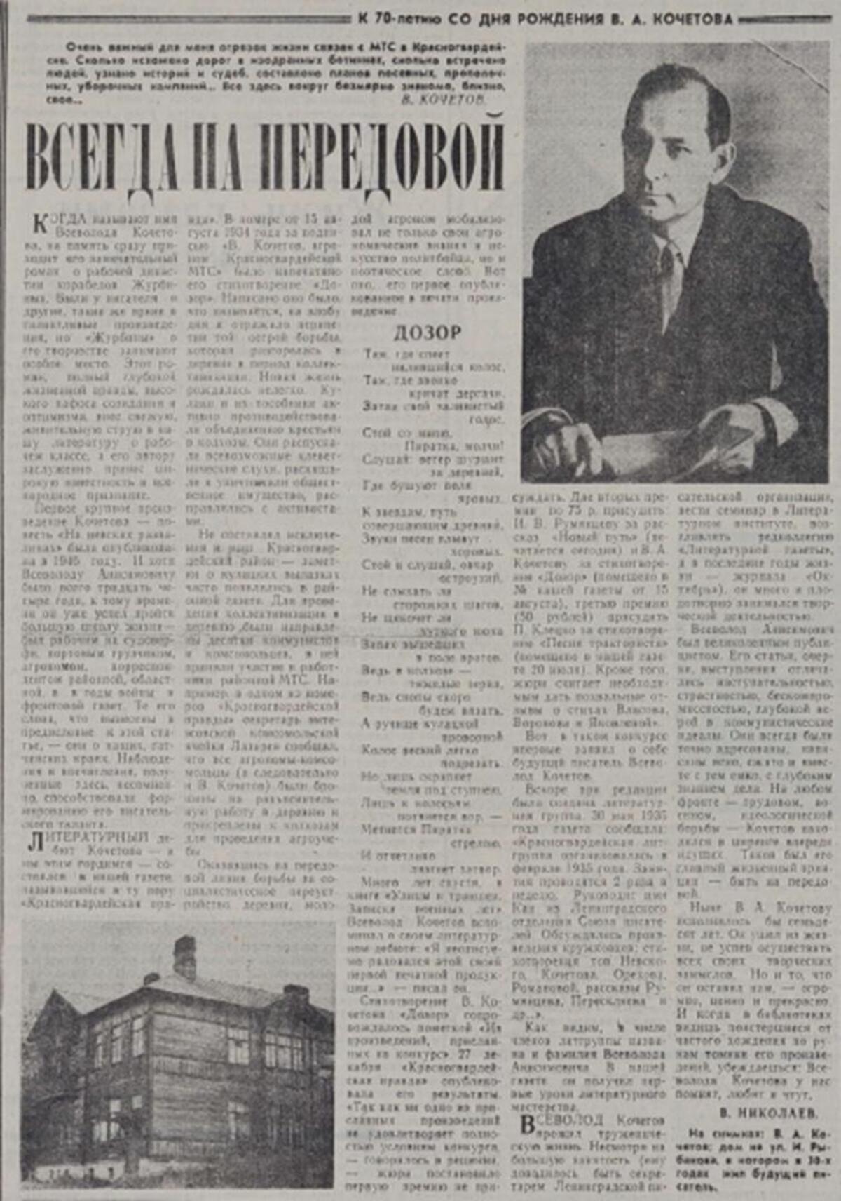 Помимо этого стихотворения, в «Красногвардейской правде» печатались также заметки о социалистическом преобразовании гатчинских деревень, подписанные «Агроном Гатчинской МТС В. Кочетов».