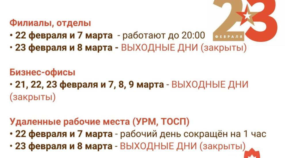 Выходными (нерабочими) днями во всех филиалах, отделах и удаленных рабочих местах будут 23 февраля и 8 марта.