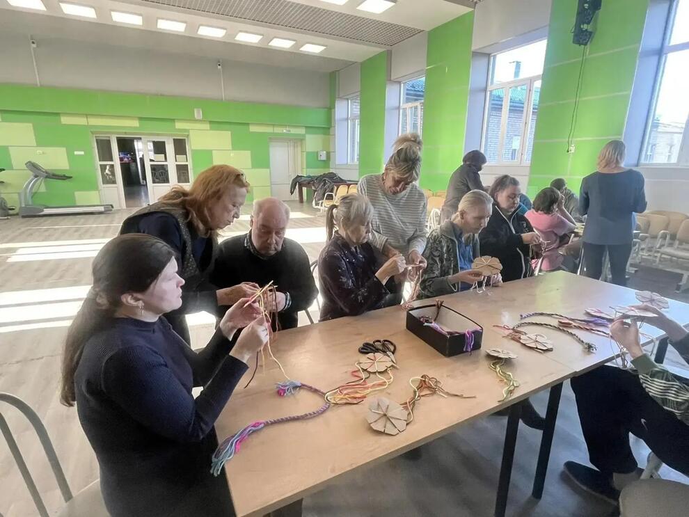 В руках у каждого участника мастер-класса оказался маленький картонный станок, на котором предстояло соткать поясок, чередуя цветные нити и следя за узором. Важно было не запутаться и направить каждую ниточку по правильному пути – для проживающих, несомненно, очень полезное занятие, которое помогает задать правильное направление и мыслям.