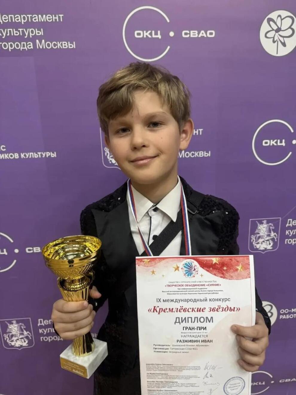 Юный солист Иван Разживин стал обладателем Гран-при в номинации эстрадный вокал. Несмотря на юный возраст, Ваня серьезно занимается музыкой: защищает честь родной школы на творческих конкурсах, повышает уровень исполнительского искусства в вокально-эстрадной студии «Маленькая страна» Гатчинского городского Дома культуры под руководством Лилии Линник.