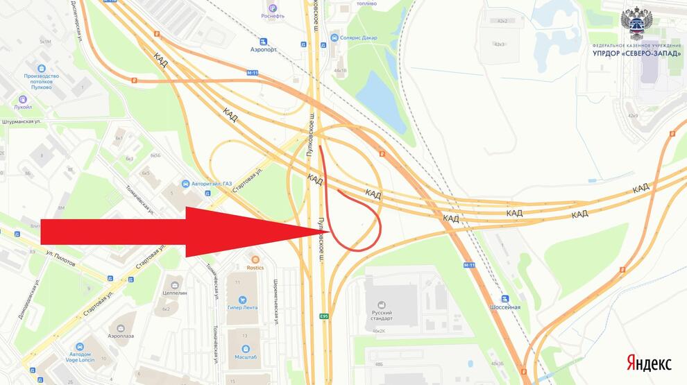 Съезд с внешнего кольца КАД на Пулковское шоссе полностью перекроют