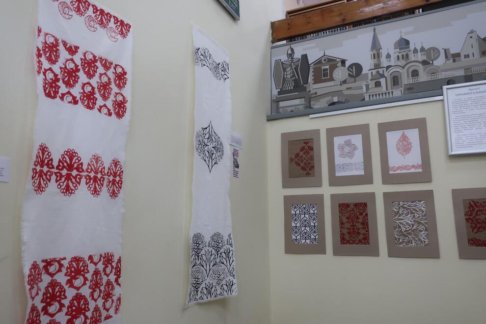 Представленная экспозиция – пока лишь часть большого проекта, первые пробники орнаментальных тканей, которые студенты в дальнейшем будут печатать на одежде и текстиле для дома.
