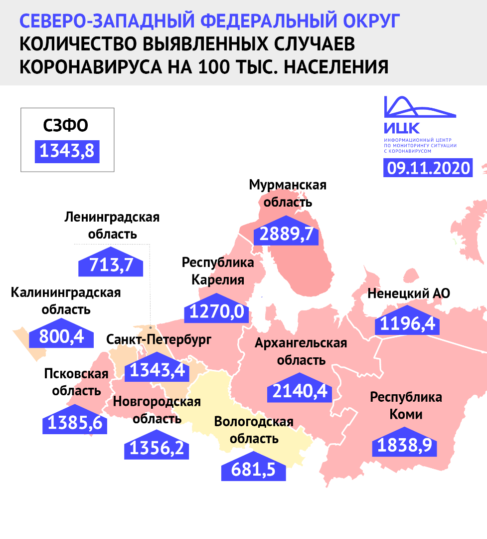 В Ленинградской области по данным Роспотребнадзора на 9 ноября коронавирусная инфекция диагностирована у 12867 человек (за минувшие сутки – 165 новых заболевших), 6938 человек поправились, 117 скончались. Таким образом, поправились из числа заболевших ленинградцев 53,9 %.