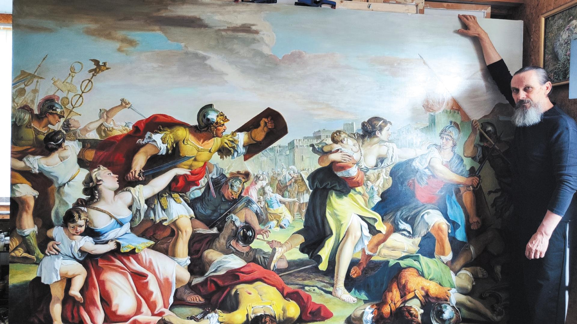 - Это копия работы великого Себастьяно Риччи «Сражение римлян и сабинянок». Работа уже подходит к концу. Если быть абсолютно точным, размер картины 198 на 303. Много слоев, как у старых мастеров. Закончен уже цветовой период, сейчас начнется проработка мелких деталей. Самое приятное время для художника.