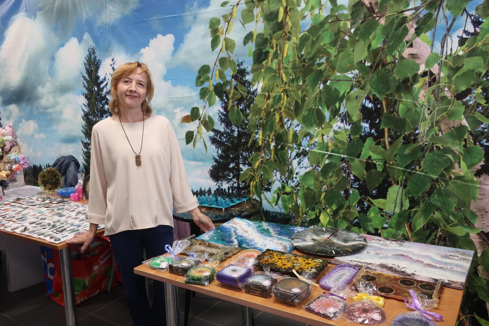 Кристина привезла из Гатчины вязаные вещи, вышивку, изделия из натуральных камней и чудесных кукол ручной работы. Художница Юлия Саунина живет в деревне Малая Оровка под Пудостью. На «Осеннюю ярмарку» она представила необычные украшения, картины и предметы интерьера из эпоксидной смолы. Тканые изделия, представленные Любовью Пакканен, напомнили об ингерманландских корнях Пудостьской земли. Любовь занимается ткачеством три года, освоила множество разных техник. На специальном станке она сплетает уникальные изделия из натуральных материалов: аксессуары, одежду и предметы для интерьера и кухни, которые помогают создать в доме атмосферу уюта, тепла и любви.