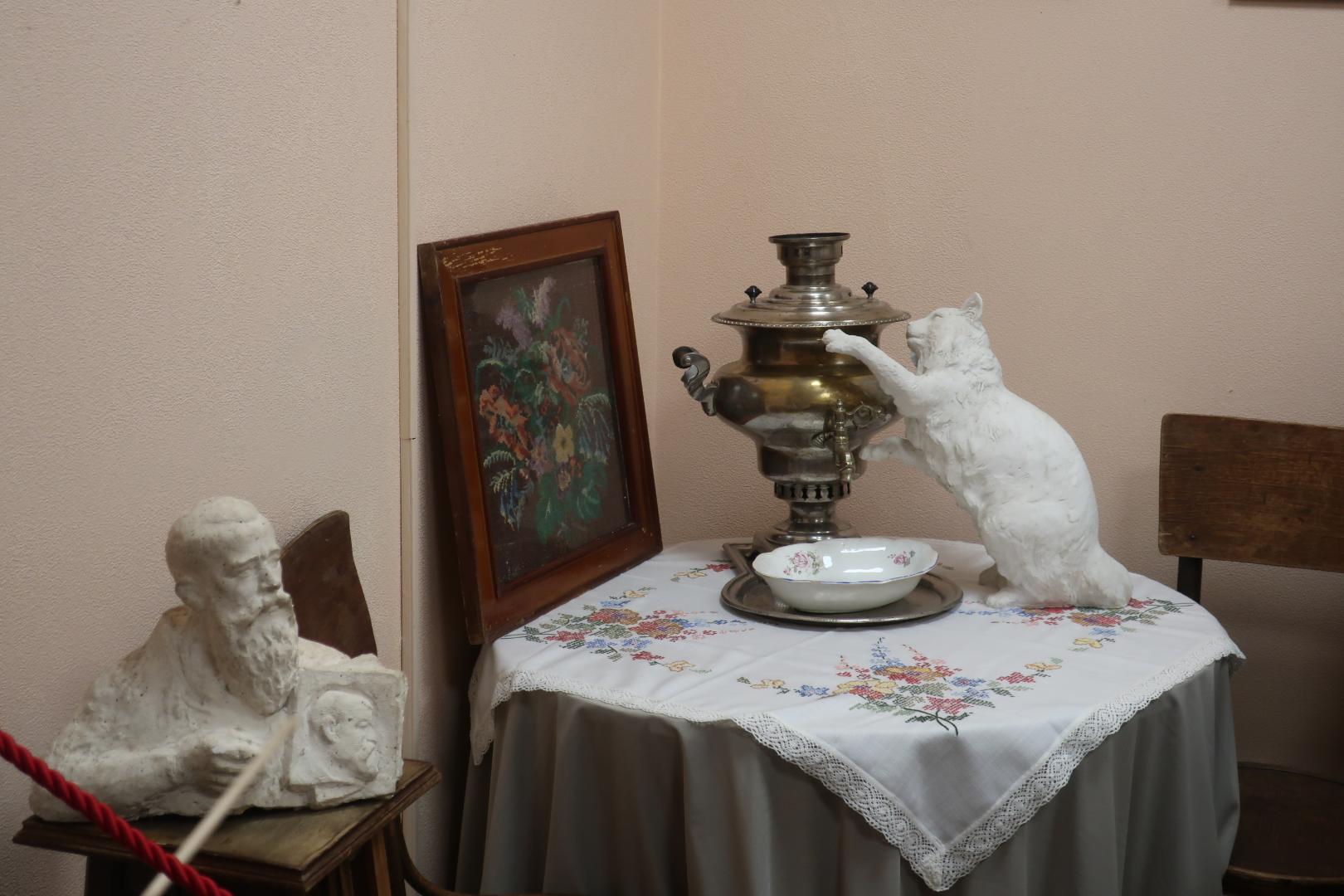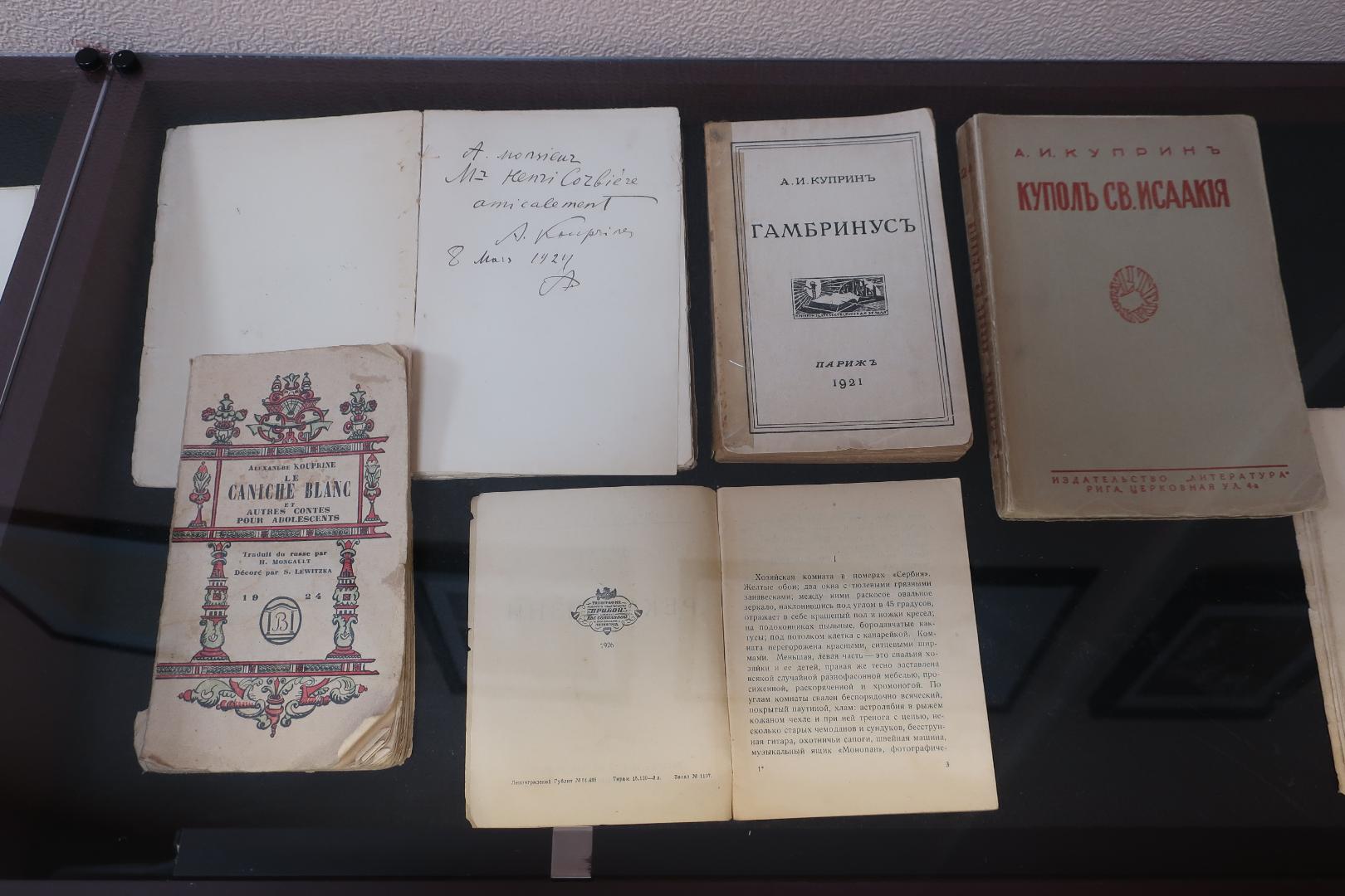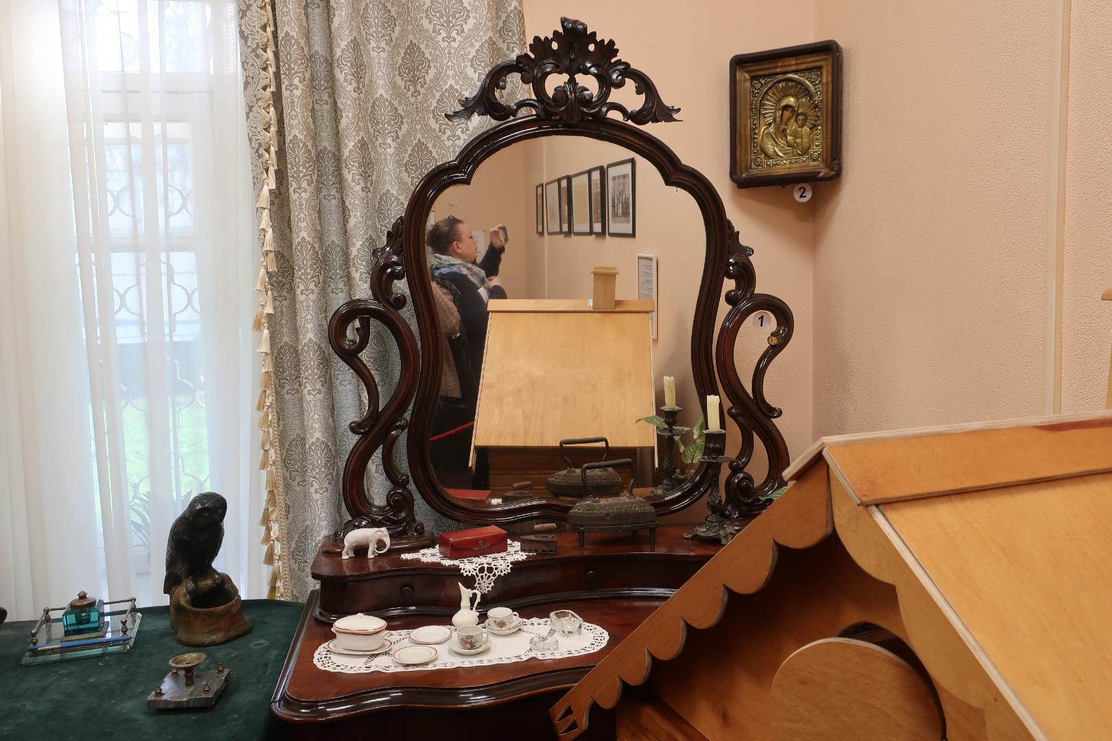 Внимательно изучив зафиксированные на фотоснимках детали интерьеров, сотрудники музея подобрали максимально аутентичные экспонаты. Старинный письменный стол, стул и подсвечник (предположительно из утраченного дома Куприных), большое зеркало, игрушечная детская коляска, икона Казанской Божией Матери, портновские ножницы – каждый из этих предметов имеет свою историю. Здесь же представлена копия самодельного кукольного домика со столиком, сервированным подлинной миниатюрной фарфоровой посудой начала ХХ века. С этим домиком играла дочь Куприна, Ксения, называя его «кошкин дом», поскольку его облюбовали и пушистые обитатели дома.