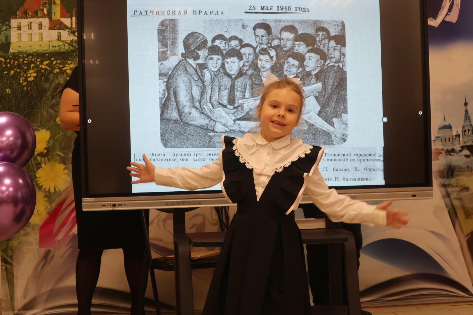 Перед началом праздника гос-ти могли ознакомиться с историей Гатчинской детской библиотеки, раскрывающейся в документах и фотографиях. За несколько лет кропотливой работы сотрудникам удалось восстановить ее летопись. Как оказалось, детская библиотека существовала в Гатчине уже в 20-е годы прошлого века. Впервые она упоминается в докладе «О библиотечном деле в Гатчине» на президиуме Гатчинского исполкома, заслушанном в 1920 году. В марте этого года была основана центральная школьная библиотека, в которую было передано до 1800 томов из Центральной библиотеки. Позднее эта библиотека получила название детской библиотеки города Гатчины.