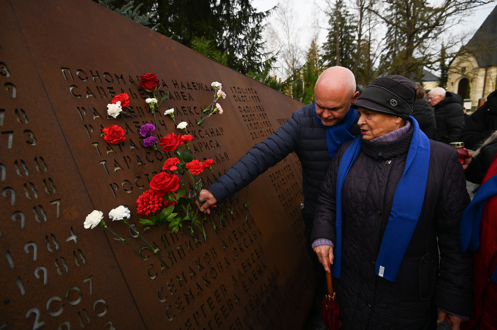 Родные и близкие погибших, жители региона почтили память погибших минутой молчания и возложили цветы к мемориалу.