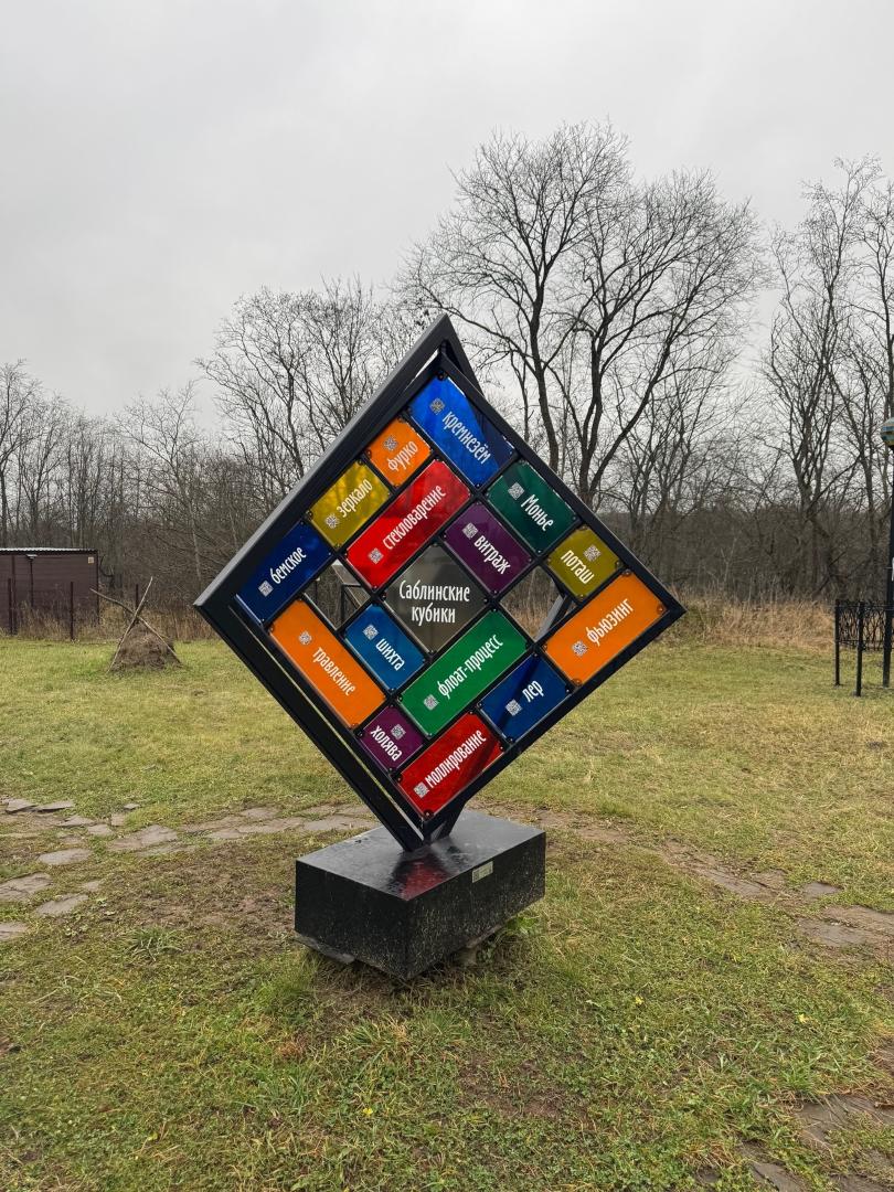 «В Саблинских горных выработках добывался стекольный песок. Его качество было настолько высоким, что стекольный магнат Максимилиан Франк в начале XX века построил здесь большой стекольный завод. На фабрике Рихтера, от которой сегодня остались лишь руины, было налажено производство саблинских каменно-строительных кубиков. Из чего именно они изготавливались, до сих пор остаётся загадкой, но есть патент на немецком языке, где говорится, что в их составе известь, песчаник, олифа или льняное масло. Так как информации об этом практически нет, мы решили познакомить наших посетителей с этим эпизодом истории. Проект «Саблинские кубики» рассказывает о стекольном производстве через малые архитектурные формы, представленные в виде прозрачных кубов. Местная традиция украшения домов и садов цветными стеклянными шарами также нашла отражение в арт-объектах над Левобережной пещерой», — рассказала Валентина Васильевна.