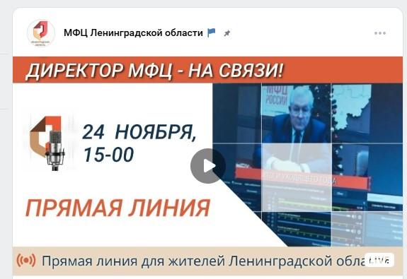 В прямом эфире «Директор МФЦ – на связи!» будут анонсированы актуальные новости МФЦ 47 региона, популярные услуги и сервисы. Жители региона могут обратиться с вопросами на горячую линию и получить развёрнутый ответ руководства МФЦ Ленинградской области.
